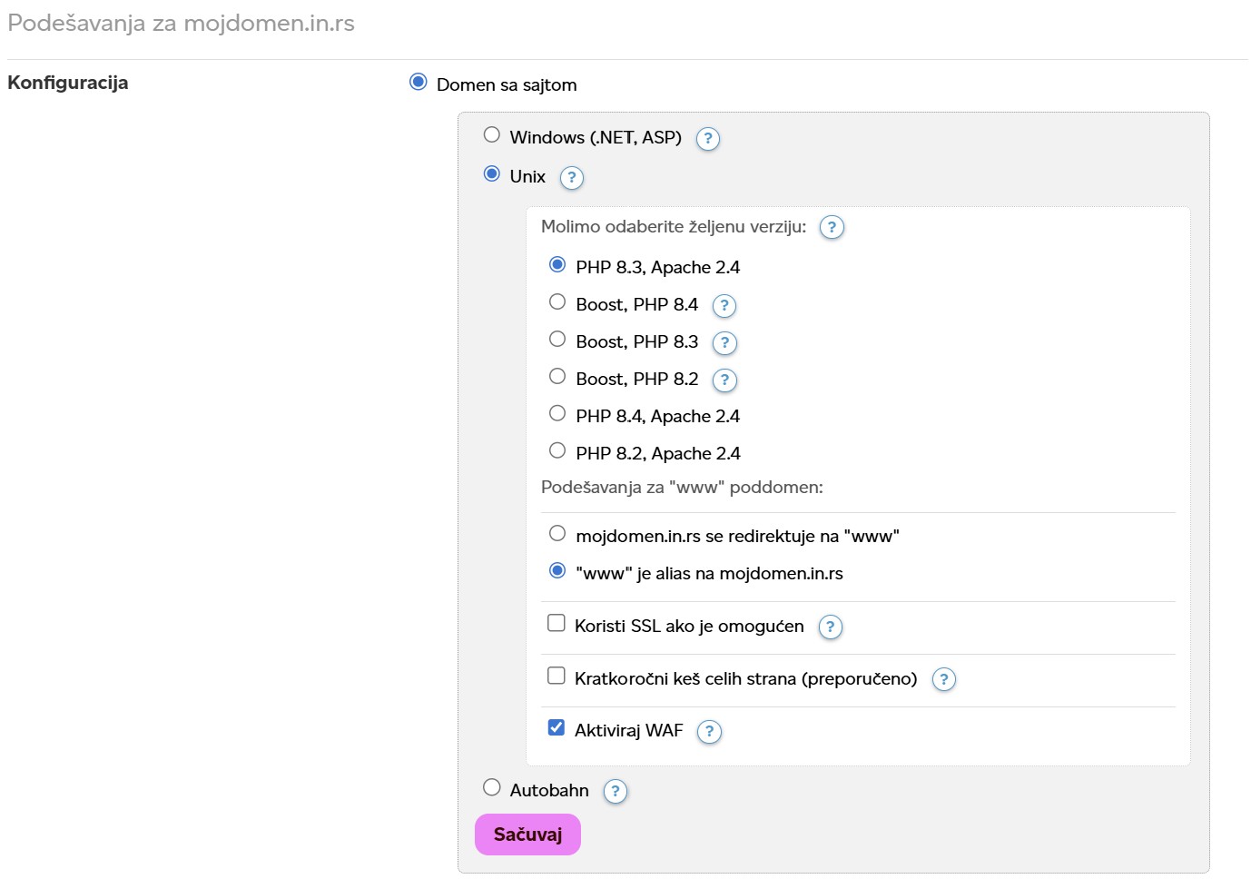 • registrovani domen sa Unix konfiguracijom u našoj korisničkoj zoni