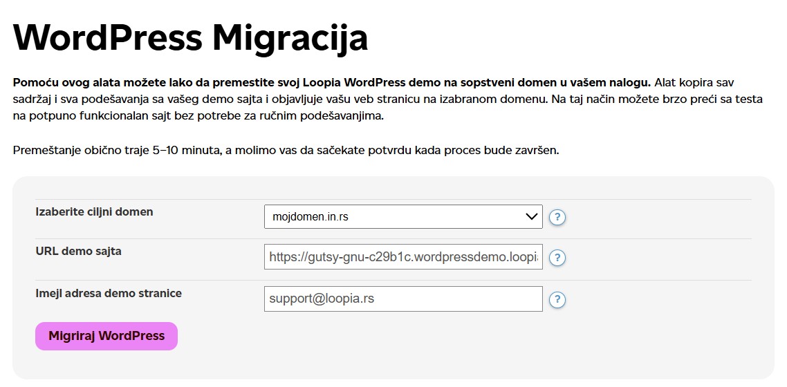 U sledećem koraku izaberite vaš domen koji imate na UNIX-u, unesite URL (adresa) vaše demo stranice i e-mail adresu koju ste naveli kada ste pokrenuli vašu demo stranicu. Kada je sve navedeno i tačno, kliknite na „Migriraj WordPress“.